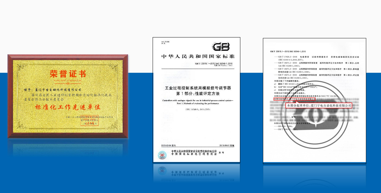 宇電積極參與國家標準制定工作,主持起草了《GB/T 20819.1-2015 工業過程控制系統模擬信號調節器》標準,該標準為溫控器調節器最主要的國家標準;并參與《溫度測量設備電子數據交換用屬性列表》等50多項國家標準制定。
